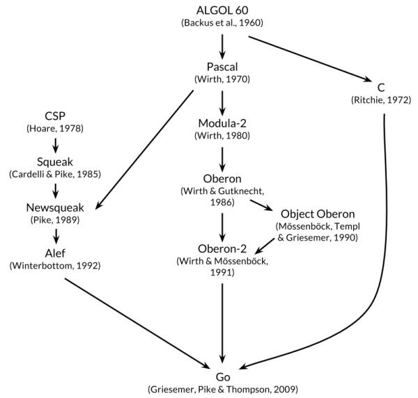 但是在Go语言的家族树中还有其它的祖先。其中一个有影响力的分支来自Niklaus Wirth所设计的[Pascal][Pascal]语言。然后[Modula-2][Modula-2]语言激发了包的概念。然后[Oberon][Oberon]语言摒弃了模块接口文件和模块实现文件之间的区别。第二代的[Oberon-2][Oberon-2]语言直接影响了包的导入和声明的语法,还有[Oberon][Oberon]语言的面向对象特性所提供的方法的声明语法等。