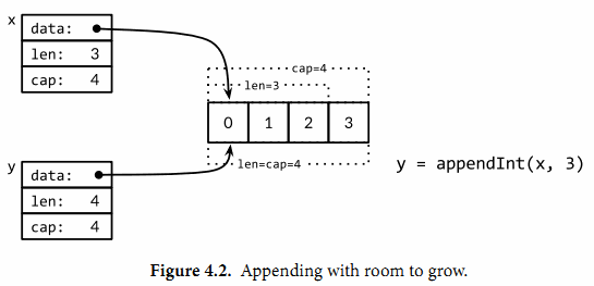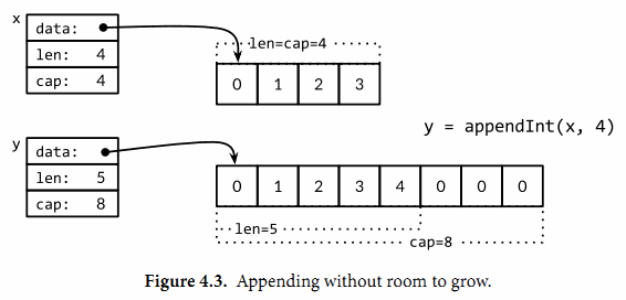 讓我們仔細査看i=3次的迭代。當時x包含了[0 1 2]三個元素,但是容量是4,因此可以簡單將新的元素添加到末尾,不需要新的內存分配。然後新的y的長度和容量都是4,併且和x引用着相同的底層數組,如圖4.2所示。