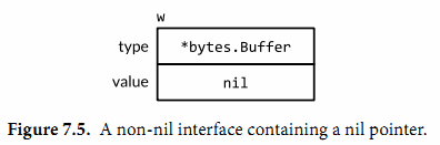 当main函数调用函数f时,它给f函数的out参数赋了一个*bytes.Buffer的空指针,所以out的动态值是nil。然而,它的动态类型是*bytes.Buffer,意思就是out变量是一个包含空指针值的非空接口(如图7.5),所以防御性检查out!=nil的结果依然是true。